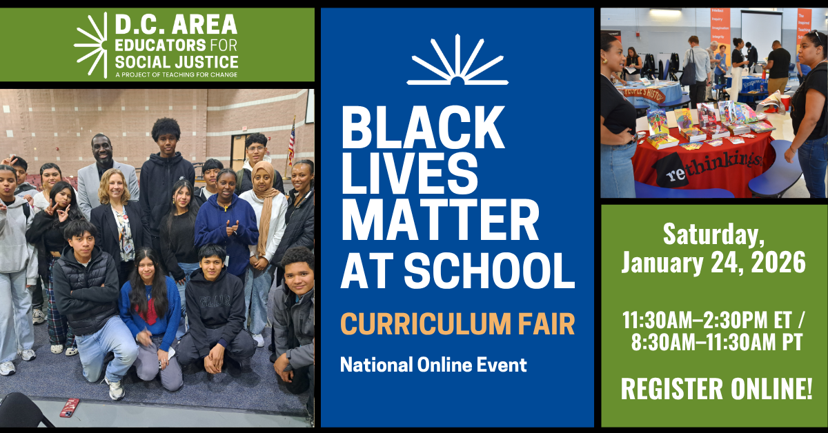 On Saturday, January 24, 2026, Teaching for Change’s D.C. Area Educators for Social Justice will host an online curriculum fair featuring a keynote speaker and workshops set to uplift the guiding principles that focus on improving the school experience for Black students.