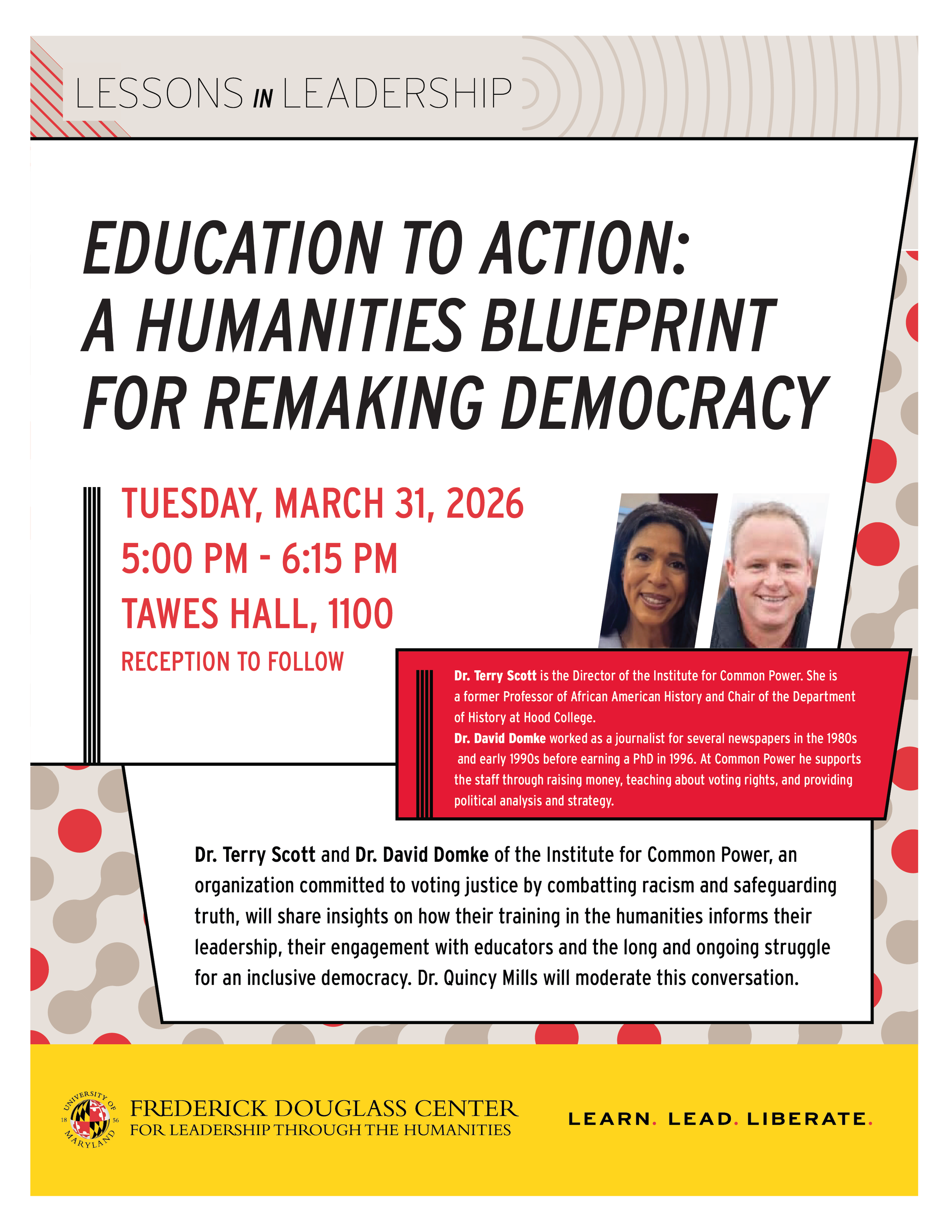 Join the Frederick Douglass Center for Leadership Through the Humanities on March 31 at Tawes Hall Room 1100 at University of Maryland as they host Dr. Terry Scott and Dr. David Domke for our Lessons in Leadership Speakers Series.