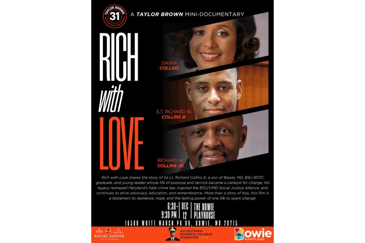 The City of Bowie, in partnership with the Bowie State University/University of Maryland Social Justice Alliance, invites you to a screening of Rich With Love, a moving mini-documentary honoring the life and legacy of 1LT Richard W. Collins III, a Bowie State University ROTC graduate who was tragically killed in a racially motivated hate crime on the University of Maryland campus in 2017, just three days before his college graduation.